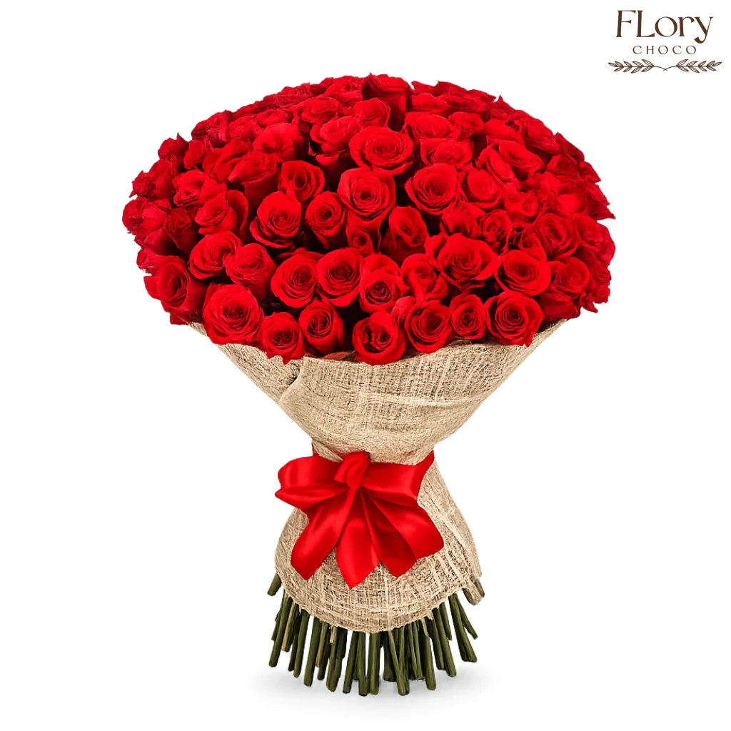 Pure passion in its most beautiful form — this stunning arrangement features 100 fresh red roses, carefully hand-tied and wrapped in natural burlap with a vibrant red ribbon. The rich red blooms create a full and luxurious look that instantly captures attention.
