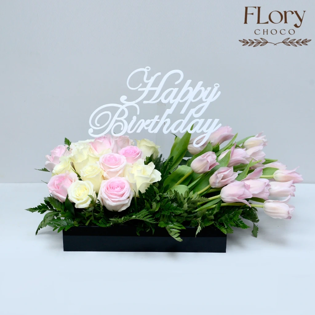 The arrangement includes fresh roses and tulips, with lush leather leaves for a full and elegant look. Perfect for birthday surprises, this floral gift is simple, beautiful, and made to bring smiles.