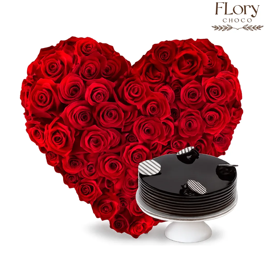 Featuring a heart-shaped bouquet of fresh red roses and a delicious chocolate cake, it’s a perfect way to show that your love is as sweet as it is enduring.