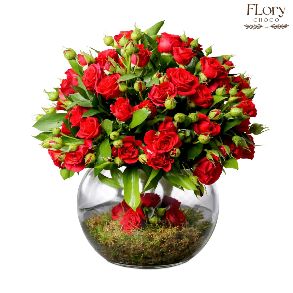 Fresh, elegant, and full of charm — Rosanova is a beautiful glass vase arrangement of red roses with delicate buds and lush green leaves. Set in a clear round vase, it creates a modern and graceful look that instantly brightens any space.